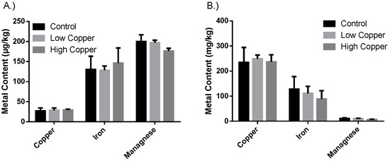 Total metal content of wort in µg/kg (A) and recovered trub in mg/kg (B) as determined by ICP-MS. Error bars represent standard deviation (n = 3). Multiple comparisons within each metal revealed no significant differences (p > 0.05).