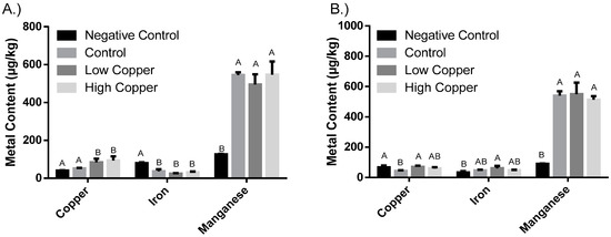 Total metal content (µg/kg) of all dry-hopped and unhopped beers in the absence of yeast (A) and in the presence of yeast (B). Error bars represent standard deviation (n = 3). One-way ANOVA was used to determine significant differences (p < 0.05) among treatments within a yeast treatment for a given metal. Significant differences between means were determined by Tukey’s honestly significant differences, and these differences are indicated by the letters above each bar (HSD, α-level = 0.05). Treatment means that do not share the same letter within a given metal are significantly different from one another.