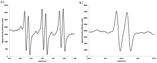 Sample electron paramagnetic resonance (EPR) signal of the N-tert-Butyl-α-phenylnitrone (PBN)-1-hydroxyethyl radical (PBN-1-HER) spin adduct (A) and the first doublet in the 1-HER-PBN adduct (B) measured to determine the rate of beer oxidation. Peak amplitude was expressed in arbitrary units and determined using ESR-MPlot software.