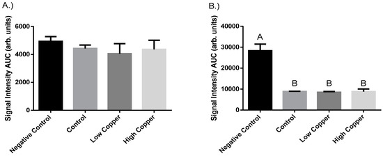 The 1-HER generation was calculated as the AUC for the PBN-1-HER spin adduct signal intensity (Figure 4B) over a period of 160 min. For the beers dry-hopped in the presence of yeast, no significant differences (p > 0.05) were found between the control (8891 ± 103.1 arb. units), low copper (8488 ± 358.9 arb. units), or high copper (8779 ± 1287 arb. units) treatments (Figure 5A). No significant difference (p = 0.3005) was observed in the AUC values for beers hopped with control (4,431 ± 244.5 arb. units), low copper (4051 ± 721.1 arb. units), or high copper hops (4367 ± 652.2 arb. units), nor the negative control (4938 ± 337.9 arb. units) in the absence of yeast during the dry hopping period (Figure 5B). The signal for the negative control of the yeast-present group, however, was significantly higher than the other treatments (28,319 ± 3182 arb. units, p < 0.0001). The increased oxidative instability of the negative control, in this case, may be due to the condition of the yeast used during dry hopping. When the signal intensities within each hop treatment are compared among yeast treatments using a two-way ANOVA with Sidak’s multiple comparisons (α = 0.05), the signal intensities are significantly elevated in the samples with yeast present during dry-hopping (p < 0.0001). It is generally accepted that yeast cells increase the stability of beer, acting in a reductive capacity [43,44]. In the present study, lyophilized yeast was added to beer containing sodium azide that was intended to render the yeast non-viable and prevent the refermentation of sugars that may be liberated by endogenous hop enzymes. Sodium azide is known to function as a biocide through its inhibition of mitochondrial function [45]. This may have altered yeast viability in a manner that depleted its reducing capacity, resulting in the observed increase in 1-HER radical generation. The addition of hops to the samples with yeast present may have prevented or inhibited oxidation induced in the EPR assay through the contribution of antioxidative compounds, including hop phenolics and hop acids [46]. It is likely that the negative control, which was unhopped, would not benefit from the protective antioxidant effects of those hops and oxidize more rapidly.
