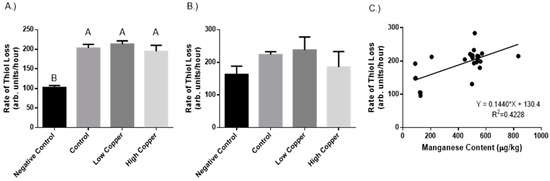 Rates of thiol loss for beers hopped in the absence of yeast (A) and in the presence of yeast (B) and the correlation between total manganese content and rate of thiol loss (C). One-way ANOVA was used to determine significant differences (p < 0.05) among treatments within a metal and yeast treatment. Significant differences between means were determined by Tukey’s HSD, and these differences are indicated by the letters (A or B) above each bar. Treatment means that do not share the same letter are significantly different from one another. Simple linear regression was used to determine correlations between metal content and rates of thiol loss.