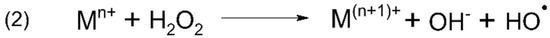 The generation of hydroxyl radicals by the single electron reduction of hydrogen peroxide through a Fenton-like reaction catalyzed by the oxidation of transition metals (M) of oxidation state (n).