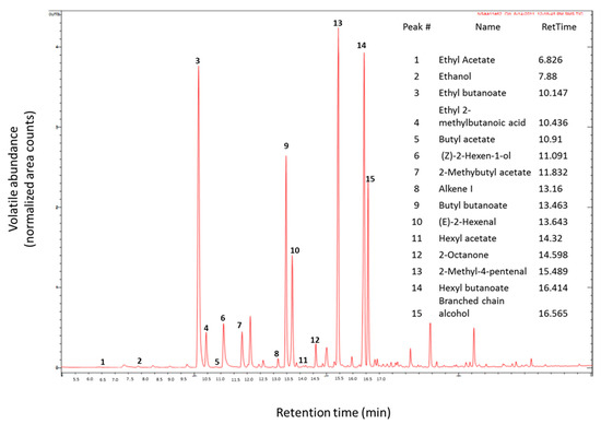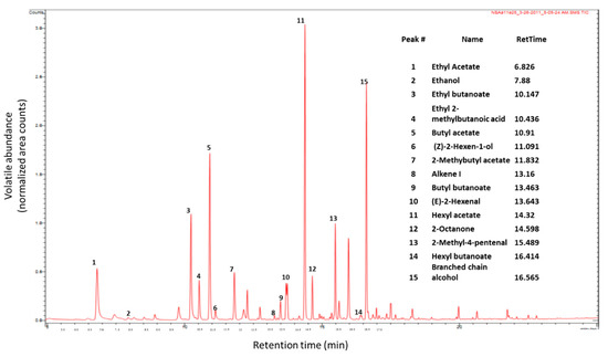 In addition to straight-chain esters, a branched-chain ester, 2-methyl butyl acetate, was one of the most abundant volatile compounds detected in Honeycrisp and McIntosh juices. Owing to its lower threshold value, 2-methyl butyl acetate has been described as one of the most significant odor active volatile compounds in other apple cultivars, including Gala [24].