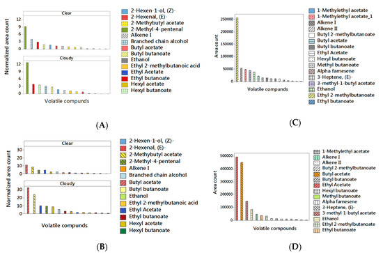 The relative abundance of volatile compounds identified in fresh, clear, and cloudy apple juices from McIntosh (A) and Honeycrisp (B) apples, as well as from whole McIntosh (C) and Honeycrisp (D) apples stored for 4 months under controlled atmosphere (CA) or regular atmosphere (RA) conditions and harvested at commercial or late maturity stage. The value for each bar represents the mean of 48 samples each with three biological replicates.
