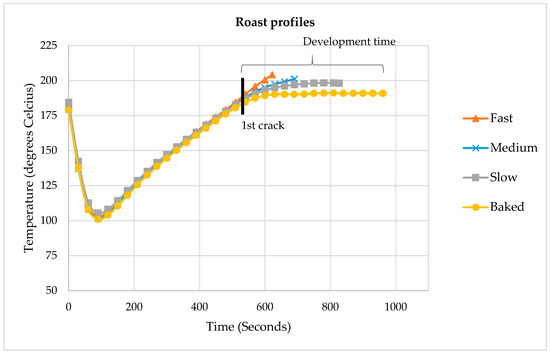 Figure 1 illustrates the time–temperature relationships of the four roast profiles. First crack occurs approximately at 570 s into the roast. The slope of the curve past this point is the focus of the present study and roast profile development. Therefore, the modulations are indeed subtle and the roasted beans appear visually identical despite large differences in roast time after first crack. The four profiles represent the spectrum of potential development time modulations from fastest to slowest possible at the given roast degree.