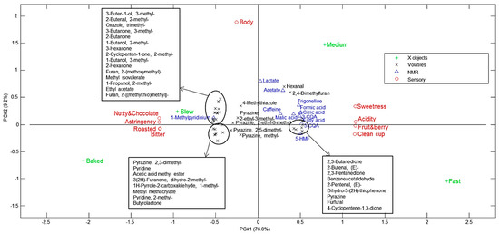 PLS-model Bi Plot with NMR and GC–MS data(x) and sensory data(y).