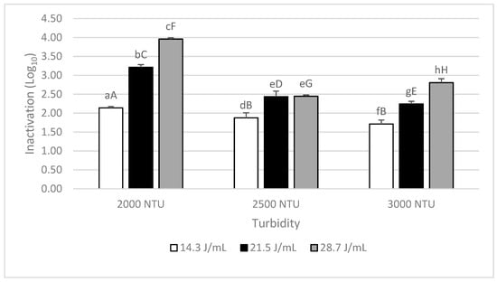 Inactivation of B. subtilis spores in PBS-fibre with different turbidity values modified with apple fibre. These suspensions were treated by UV-C at the doses of 14.3, 21.5, and 28.7 J/mL. Different lowercase letters represent significant differences (p < 0.05) between samples means of the same turbidity value but a different UV-C dose; capital letters represent significant differences between sample means of those ones treated with the same UV-C dose but with a different turbidity value.