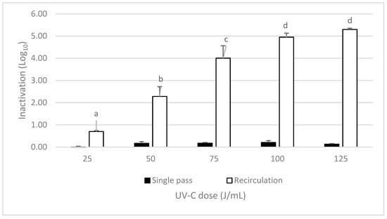Inactivation of A. acidoterrestris inoculated in cloudy apple juice with ascorbic acid by UV-C at different doses (25, 50, 75, 100, and 125 J/mL) in a single pass (black bars) or in recirculation (white bars). Error bars mark the standard deviation, and letters represent significant differences (p < 0.05) between sample means of the same treatment. No letters mean that there were no significant differences found between doses.