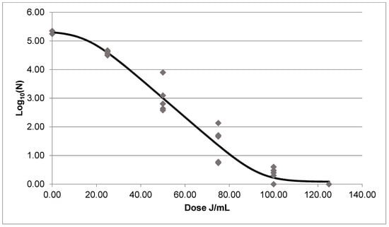The data gathered from UV-C experiments with recirculation were utilized for adjusting to an inactivation model using GInaFiT software. Several inactivation models were assayed, from which it was selected the one with the highest R2 (0.9772) and the lowest RMSE (0.3293), being that the Geeraerd shoulder tail model [21] (Figure 3), with an equation (Equation (2)). This was used to calculate the inactivation kinetics of A. acidoterrestris spores in this type of apple juice. The analysis of the inactivation kinetics allowed to obtain the 4D value of 76.25 J/mL, that was the estimated dose required to inactivate 4 Log of A. acidoterrestris spores in apple juice under these treatment conditions.