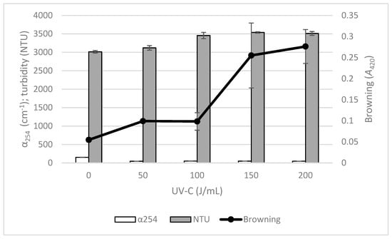 Physicochemical changes in apple juice with added ascorbic acid after UV-C treatments applied with recirculation at different doses (50, 100, 150, and 200 J/mL). α254 (cm−1) is represented by white bars, turbidity (NTU) is represented in grey bars, and browning (unitless) is represented by the plot line. Error bars mark the standard deviation between samples mean.