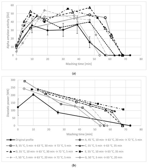 The activities of solubilized amylases as measured by the Brewer’s Dream™ method during mashing is shown in Figure 1 and Figure 2, for the different time-temperature profiles. For comparison purposes, the original profile is shown with a confidence interval of 95%. For most laboratory scale results, duplicate results were comparable (<10 DU for α-amylase, <30 WK for diastatic power). The only exception was profile B, for which some of the replicates varied by more than 10 DU for α-amylase. Therefore, these results are not shown in the present study. The results of α-and β-amylase are comparable to other studies [2,7,12]. α-Amylase activity follows a reverse u-shape profile over the time, with a plateau in the 63–65 °C step. The initial increase in the first minutes is due to the release of enzymes into the wort, whereas the following plateau is due to the thermal stability of α-amylase at 63–65 °C. The sudden decrease at the end is caused by the temperature increase to 72 °C (or 78 °C), where α-amylase shows less stability [1,2,9]. β-Amylase activity decreases over the time, except for the initial increase observed if a sample is taken at the beginning of mashing. As for α-amylase, the initial increase is due to the extraction of β-amylase into the wort. The continuous decrease, more pronounced than for α-amylase, is due to the lower thermal stability of this enzyme [1,2,9].