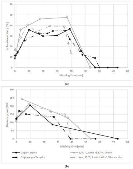 - Evans, D.E.; Fox, G.P. Comparison of Diastatic Power Enzyme Release and Persistence during Modified Institute of Brewing 65 °C and Congress Programmed Mashes. J. Am. Soc. Brew. Chem. 2017, 75, 302–311. [Google Scholar] [CrossRef]