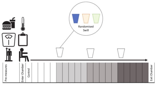 Testing began with 15 min of passive sitting, during which the time outcome data were recorded by the researcher, but no swilling took place. Following this control period (CON), participants commenced the swilling of solutions. Each solution was swilled five times at three-minute intervals, before progressing onto the next solution (note shaded areas in Figure 1). Once the final swill was completed and outcome measures recorded, the participants exited the chamber. The experimental procedure is pictorially represented in Figure 1.