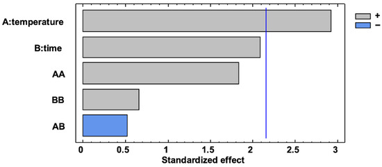 Based on the evaluation of the statistic results, it was determined that temperature was the variable with the greatest influence on the concentration of polyphenols (Figure 1), with a direct correlation. It was also observed, that the samples that had been obtained at higher temperatures presented higher TPI and FCI values. Therefore, high temperature values (60 °C) were used.