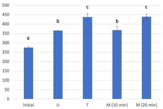 FCI (ppm gallic acid) obtained by the different extraction methods used. U: ultrasound; T: traditional; M: microwave 10–20 min extraction. Initial: Unmacerated vinegar sample. Different letters indicate significant differences according to Tukey’s test (p < 0.05).
