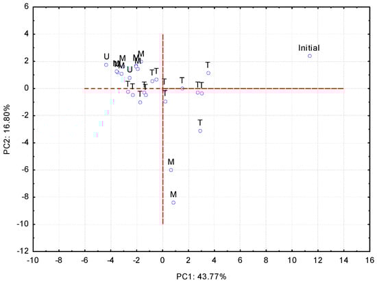 Principal component analysis of the samples subjected to the different maceration procedures. U: ultrasound; T: traditional; M: microwave. Initial: unmacerated vinegar.