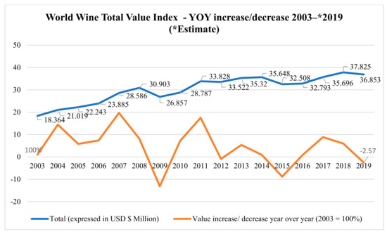 World wine total value index-year-over-year (YOY) increase/decrease. 2003–*2019 (*estimate). Source: International Organization of Vine and Wine [].
