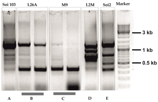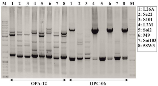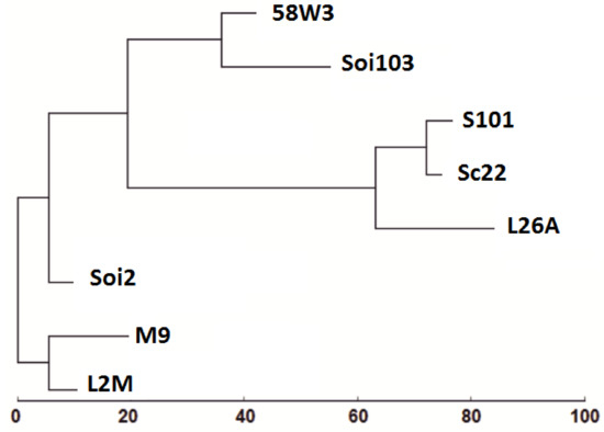 RAPD-PCR analysis with OPA-12 and OPC-06 primers showed a clear phylogenetic relationship among all strains tested (Figure 2). OPC-06 resulted in bands of low polymorphism so it was discarded from further analysis (Figure 2). The RAPD-PCR polymorphisms that were generated using OPA-12 primer were further analysed with the PyElph 1.4 software. To prepare the dendrogram we used the neighbour-joining method [59]. Reproducibility of banding patterns for the eight strains was also evaluated. Phylogenetic analysis revealed that the two Moschofilero isolates (L2M and M9) grouped together in a separate clade from the other yeast strains (L26A, Soi2, Soi103, 58W3 and Sc22) while the Soi2 strain which was isolated from the Agiorgitiko spontaneous fermentation was grouped in a second clade separated from the L26A, Soi103, 58W3 and Sc22 ones (Figure 3). Further, 58W3, Soi103, S101, Sc22 and L26A seemed to be the most phylogenetically related compared with the other strains (Figure 3).