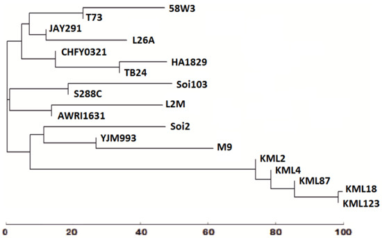 In order to validate the results of RAPD-PCR analysis, we sequenced the internal transcribed spacer (ITS) rDNA sequences of the isolated indigenous yeast strains and this of the commercial 58W3 strain. ITS sequences were subjected to BLAST analysis against other sequenced S. cerevisiae strains. The retrieved sequences were first subjected to multiple sequence alignments (Figure S1) and then were analysed using the PyElph 1.4 software. Phylogenetic analyses showed that M9 and Soi2 were grouped together with yeast strains isolated from the Montepulciano d’Abruzzo wines [60] and with the YJM993 model yeast strain (Figure 4). Additionally, L2M and Soi103 were grouped with the AWRI1631 and the reference S288C yeast strains respectively (Figure 4) while the L26A and 58W3 were grouped with a vast variety of yeast strains like JAY291, CHFY0321, T73, TB24 and HA1829 (Figure 4).