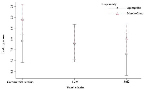For Moschofilero and Agiorgitiko wines, sensory evaluation tests resulted in almost similar scores (Figure 5). According to the global sensory quality, including the evaluation of wine appearance, aroma, flavour and texture, the wines produced with the indigenous S. cerevisae strains resulted in similar sensory profiles when compared to the control ones. More precisely, the average tasting score for both fermented must varieties, Moschofilero and Agiorgitiko, were similar for L2M and Soi2 as well as with the two commercial (SC22 and STG S101) strains. Nevertheless, the two commercial reference strains exhibited greater variability to the tasting score between the two grape varieties compared to the indigenous strains.