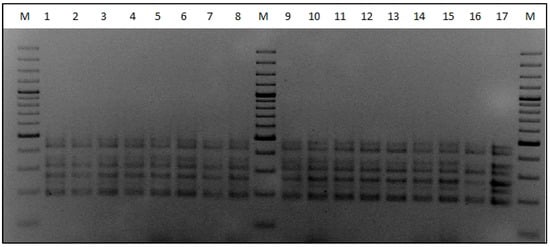 Electrophoretic profile obtained by MM-PCR of 16 colonies of S. cerevisiae strains showing the same profile of the inoculated strain (Lane 17). Lanes M: Molecular marker 100 bp.