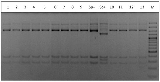 Electrophoretic profile obtained by ARDRA analysis enzymatic digestion with MspI of the colonies isolated in wine inoculated with S. paradoxus. M: Molecular marker 100 bp; lanes 1–13: colonies isolated; Lane Sp+: S. paradoxus positive control; Lane Sc+: S. cerevisiae positive control.