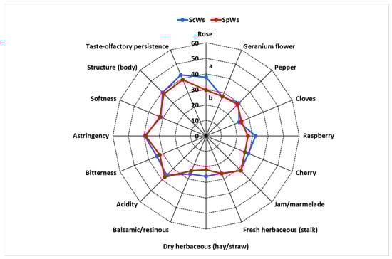 Sensory profile of Grignolino wines obtained by the two autochthonous strains. Different letters indicate significant statistical differences with ANOVA and Tukey’s test (p = 95%). (ScWs: Average profile of wines produced with S. cerevisiae; SpWs: Average profile of wines produced with S. paradoxus).