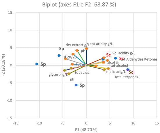 In general, wines obtained in this study have good enological properties and distinctive characteristics; this is also shown by PCA analysis (Figure 4): Wines obtained by S. cerevisiae have higher malic acid, total aldehydes and ketones and ethanol; S. paradoxus wines are mainly characterized by a higher content of glycerol.