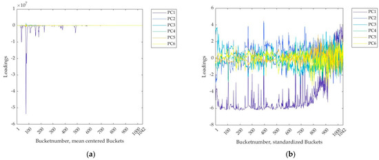 (a) Loadings from each bucket for every PLS component (PC), PLS regression (6 PLS components) with 40 commercial coffee samples and 1042 mean centered buckets for each sample; (b) loadings for each PLS component, PLS regression (6 PLS components) with 40 commercial coffee samples and 1042 standardized buckets each.