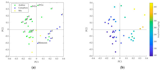 (a) Scores plot of principal components (PC) 1 and 2, 40 commercial coffee samples are marked with their known attributes: l=light roasting degree, d= dark roasting degree, +Ca= additive cardamom in Turkish coffee; (b) scores plot of PC1 and PC2, 40 commercial coffee samples are marked with their measured content of acrylamide [µg/kg].