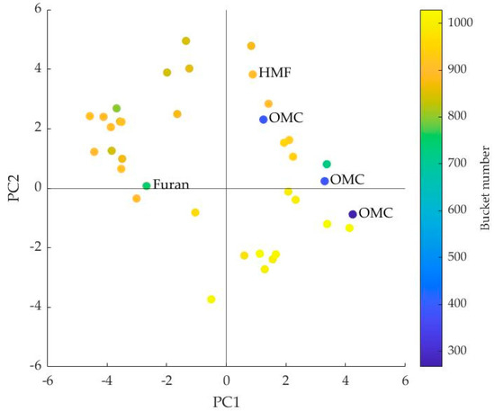 In the loadings plot, data points in the upper right square had a positive high impact on both PLS components, while in the lower left square they had a negative high impact [10]. In Figure 3, it can be seen that only bucket no. 900 (unknown), no. 966 (unknown), and no. 1018 (unknown) were located in the lower left square. In the upper right square were the buckets no. 393 (OMC) and no. 394 (OMC) and seven other buckets with an unknown compound. The buckets at the back of the spectrum (>no. 1000) all had a negative impact on PC2 and, with the exception of bucket 1018, a positive impact on PC1. The additional bucket 752 from the furan signal (8.103 ppm, s) was located just inside the upper left square and thus had a negative influence on PC1 and a small positive influence on PC2.