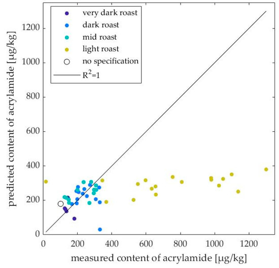 Correlation between the predicted content of acrylamide (µg/kg) and the measured content of acrylamide (µg/kg) using LC–MS/MS; coffee samples are color-coded with their roasting degree.