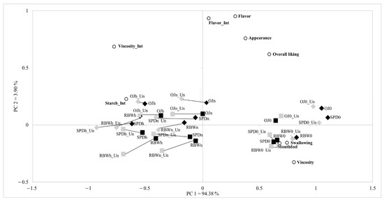 Principal component analysis biplot of thickened beverages before and after the provision of information on dysphagia 1, 2, 3. 1 Rhombus (♦) indicates the youth group (between 19 and 39 years of age); 2 Square (■) indicates the middle-aged group (aged between 40 and 64); 3 Abbreviations: PC (principal component), OJ (orange juice), RBW (red bean water), SPD (sports drink), 0 (0%), n (nectar), h (honey), Int (Intensity). Samples ending with ‘Un’ indicate the subjects were evaluated in the uninformed session.