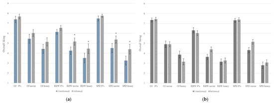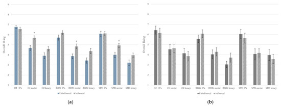 The mean value of GHI was determined for all 120 participants. The average GHI of all consumers was 4.39 ± 0.87; 66 participants had a higher GHI than the mean, and 54 participants had a lower GHI. The pre- and post-information acceptability in the low GHI group is shown in Figure 4b. A significant increase in acceptability after the provision of information was only found for the RBW nectar. In contrast, in the high GHI group, significant increases were found for OJ nectar and honey, RBW 0%, nectar, and honey, and SPD nectar and honey samples (Figure 4a). People who were more interested in health were influenced significantly by information provision.