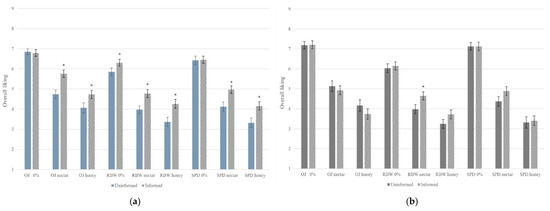 Acceptability change in the middle-aged group from dysphagia-uninformed evaluation to dysphagia-informed evaluation: (a) High GHI (n = 32); (b) Low GHI (n = 28) 1, 2, 3. 1 Evaluated using the 9-point hedonic scale ranging from dislike extremely (1) to like extremely (9). 2 Asterisk (*) means statistical difference between dysphagia-uninformed and dysphagia-informed evaluation of the same sample using independent student’s t-test (α = 0.05). 3 Error bar indicates standard error.