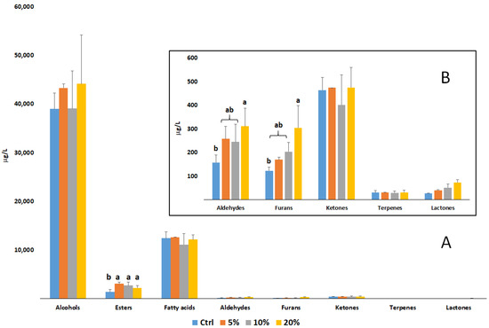 Concentration (μg/L) of quantified volatile compounds grouped by chemical classes. (A): Alcohols, esters, fatty acids. (B): Aldehydes, furans, ketones, terpenes, lactones (shown in the inset for sake of clarity, due to low amounts). For each chemical class, different letters indicate significant differences according to Tukey’s test, n = 3.