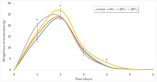 Color of beers was first evaluated following the European Brewing Convention method (Table 2) based on the spectrophotometric measurement at wavelengths of 430 and 700 nm. In conventional beers, the first parameter is linked to the wort color due to malt kilning or roasting temperatures, ranging from 2 units for pale beers, up to over 40 for darker malts [16]. As reported in Table 2, EBC color in Ctrl beer ranged from 9.73 in the initial pale wort to 9.15 for finished lager beer. This result was in line with literature [16,17] and corresponded to EBC value indicated by the brew kit producer (6–10 EBC). On the other hand, rising concentrations of grape must (5–20%) led to proportionally higher EBC values, correlated to an increase of the total color. However, EBC color analysis lacks in reliability for redder beers [17] such as, in our experiment, beers produced with the addition of fruit juices. This inaccuracy is due to the absorption of Lambrusco components (e.g., anthocyanins, polyphenols) at wavelengths different from 430 nm. Thus, in order to amend this problem and correctly describe color profile of samples, further color analyses were carried out and will be discussed in the next subsection.
