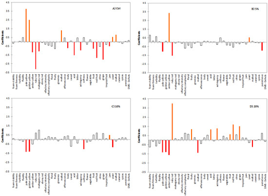 Discriminatory power of the sensory descriptors for each beer sample (A–D). Colorized histograms indicate significant discrimination at p ≤ 0.05.