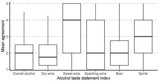 Boxplots for most of the alcohol taste statement indices (overall alcohol, dry wine, sparkling wine, and beer) showed that consumers tended to disagree that the taste and chemesthetic sensations were too intense. Conversely, most consumers tended to agree that sweet wine was too sweet (Figure 1). Thus, the finding suggests that taste sensations that are typically characterized as aversive (hot/burns, bitter, sour) and those typically considered appetitive [18] may not always be described as such by alcoholic beverage consumers. More research is encouraged to determine in which contexts and for which consumers taste and chemesthetic sensations are considered aversive or appetitive.