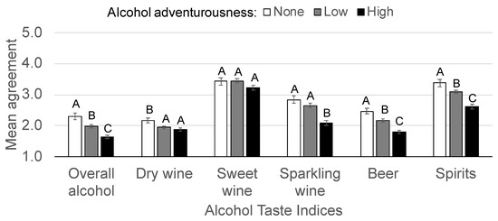 Mean scores for the alcohol taste indices grouped by alcohol adventurousness (137 none, 478 low, 464 high). Significantly different means from three-way ANOVAs indicated with different letters.