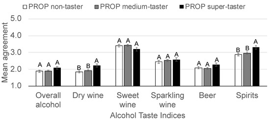 Based on the three-way ANOVAs, in general, as alcohol adventurousness increased, alcoholic beverages were described as less aversive by consumers. pST tended to describe alcoholic beverages as more aversive than pNT. Similarly, females tended to describe alcoholic beverages as more aversive than males. Differences in the magnitude between PTS groups tended to be smaller than those for sex or alcohol adventurousness. As this finding may be partially attributable to the use of PTS groups, further analysis using PROP responsiveness was warranted. To this end, Pearson’s correlation was used to test for an association between log-transformed PROP responsiveness and the alcohol taste indices. PROP responsiveness was significantly positively correlated with scores for the dry wine index (r = 0.12, p < 0.001) and the spirits index (r = 0.09, p = 0.008). Similarly, the positive correlation between the overall alcohol index PROP responsiveness (r = 0.06, p = 0.062) approach significance. PROP responsiveness was not correlated with the sweet wine index (r = −0.050, p = 0.138), the sparkling wine index (r = 0.02, p = 0.477), or the beer index (r = 0.04, p = 0.203). When a similar approach, was used to test for correlation between PROP responsiveness and the individual alcohol taste statements, results for individual statements were largely consistent with those of the index to which they belong (data not shown). However, A12 (beer tastes too bitter me) was positively correlated with PROP responsiveness (r = 0.09, p = 0.010).