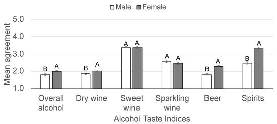 Mean scores for the alcohol taste indices grouped by sex (351 male, 528 female). Significantly different means from three-way ANOVAs indicated with different letters.