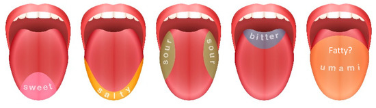 Beer is comprised of several hundred compounds affecting its aroma and taste. The terminology for the determination of beer flavor is complex and includes dynamic interactions between the senses [9]. As reported in a review by Baert et al. [9], “flavor is the sum of perceptions resulting from stimulation of the sense ends that are grouped at the entrance of the alimentary and respiratory tracts” [10,11], and flavor is comprised of four different components: odor, aroma, taste, and mouthfeel. By definition, the odor is the perception of volatiles by the olfactory mucous membrane in the nasal cavity, after sniffing through the nose and entering the nasal passage. Aroma is also connected with volatile compounds, which volatilize by body heat after putting the beverage in the mouth. In both cases, volatile compounds end up in the nasal/retronasal cavity, where they are identified by the brain. Soluble substances in the mouth recognized by the receptors located on the surface of the tongue form the reception of taste [11,12,13]. Basic tastes can be described as sweet, sour, salty, bitter, umami, and fatty (which has still not been pinned to a particular place), as shown in Figure 1 [12].