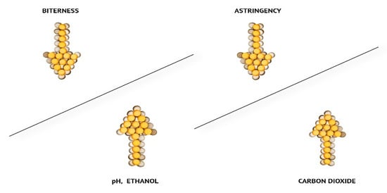 Mouthfeel is a sensation of the haptic perception of the food product on the surface of the oral cavity (the sparkling of carbon dioxide, the oiliness of fats, and astringency) [12,14,15,16]. All of these components intertwine and sum up the perceived flavor as a result of complex reactions between the senses, as can be seen from Figure 2. A good example is when beers with higher CO2 content taste more sour but less astringent.