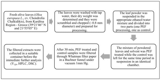 The single variety of OLL used in this study was collected on the 12 October 2020 from a single 30-year-old olive tree (Olea europaea L., cv. Chondrolia Chalkidikis), in Karditsa Region, Greece (at 39°21′46″ N and 21°55′05″ E and elevation of 108 m, according to Google Earth version 9.124.0.1, Google, Inc., Mountain View, CA, USA). The plant material processing steps are illustrated in Figure 1. Before and after each extraction run, the temperature of the treatment chamber contents was measured. In all PEF-assisted extraction runs, the temperature increments due to the treatment never exceeded a ΔT of 1 °C.