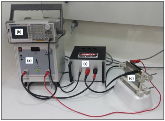 PEF System: (a) high-voltage power generator; (b) function/arbitrary waveform generator; (c) electronic switch circuit (IGBTs); (d) treatment chamber.