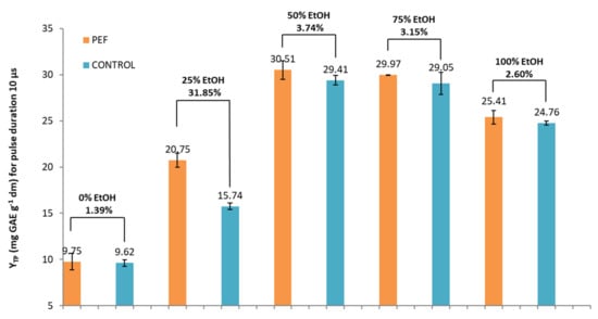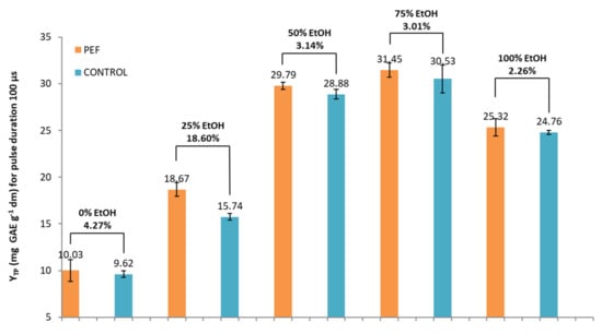 Next, a second set of PEF conditions was used. The pulse duration was increased from 10 to 100 μs, while the other PEF parameters, as well as induction time, were kept constant. The extracts were prepared using the same solvents. The results regarding the effect of EtOH addition for a pulse duration of 100 μs were similar as for a pulse duration of 10 μs. Again, the highest extraction efficiency was achieved by PEF and control samples with 50% and 75% EtOH. At a pulse duration of 100 μs, the solvent 25% EtOH, resulted again in the higher percentage increase (significant at p < 0.05) in YTP between PEF and control sample. YTP at this EtOH content (25%) was lower (by 10.02%) than the corresponding yield reached with a PEF condition of 10 μs.