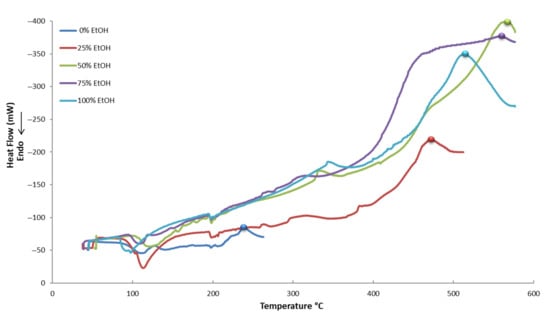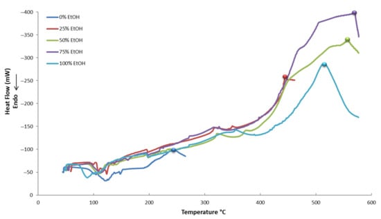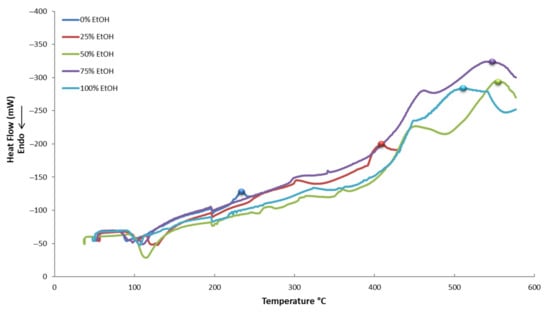 Differential scanning calorimetry (DSC) thermograms of PEF-treated (100 μs) samples in five different tested solvents.