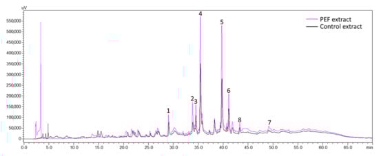 Overlay of chromatograms of PEF and control extracts with a pulse duration of 10 μs and extraction solvent 25% EtOH. Peak 1: not identified, Peak 2: quercetin-3-O-rutinoside, Peak 3: not identified, Peak 4: luteolin-7-O-glucoside, Peak 5: apigenin-7-O-rutinoside, Peak 6: luteolin-3′-O-glucoside, Peak 7: not identified, Peak 8: oleuropein.