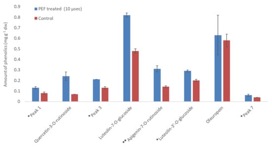 Amount of phenolics (mg g−1 dw) in PEF-treated leaves versus control at 10 μs pulse duration and 25% EtOH. * Luteolin-3′-O-glucoside and peaks 1,3 and 7 were quantified as luteolin-7-O-glucoside; ** Apigenin-7-O-rutinoside was quantified as apigenin.